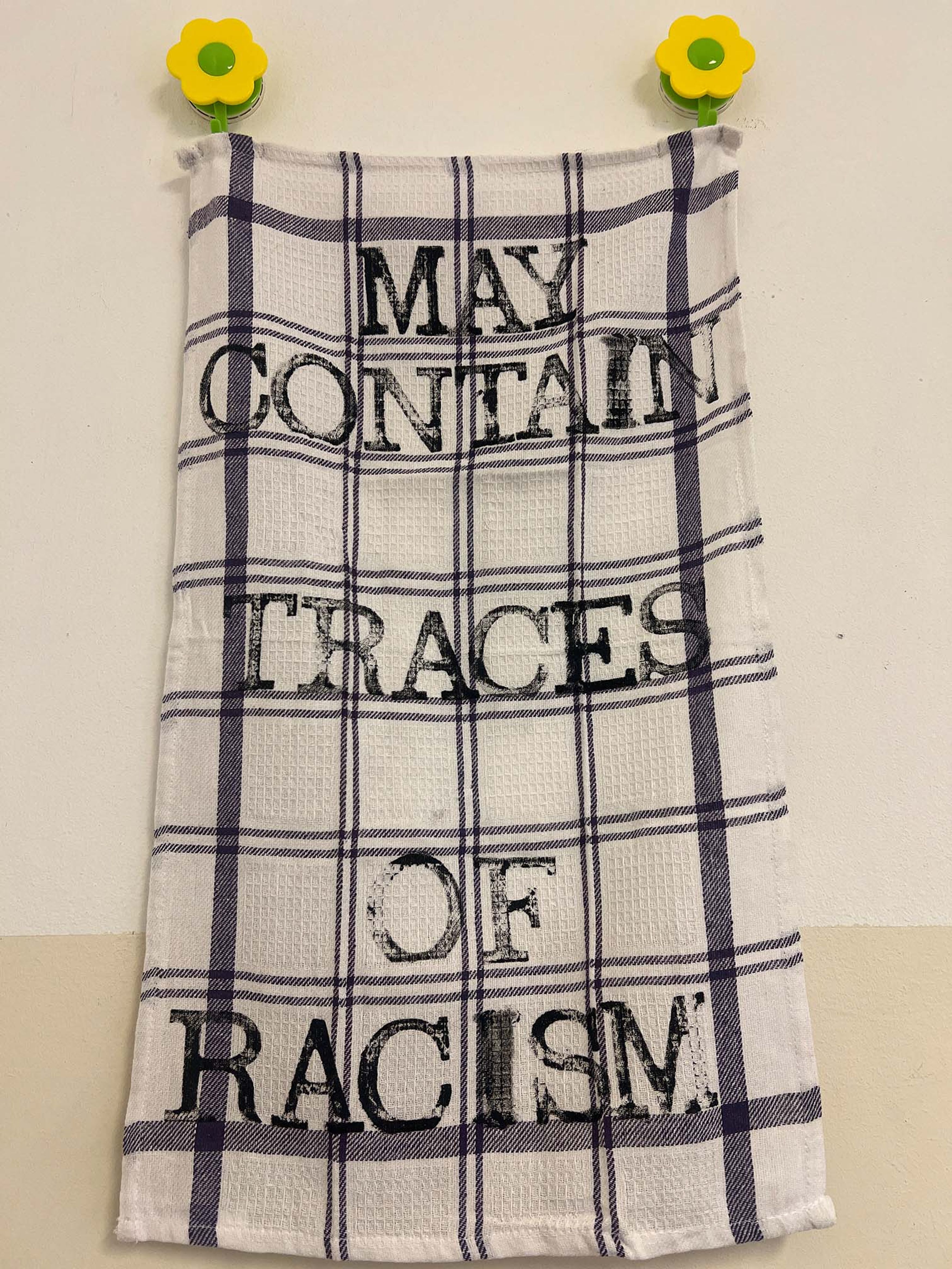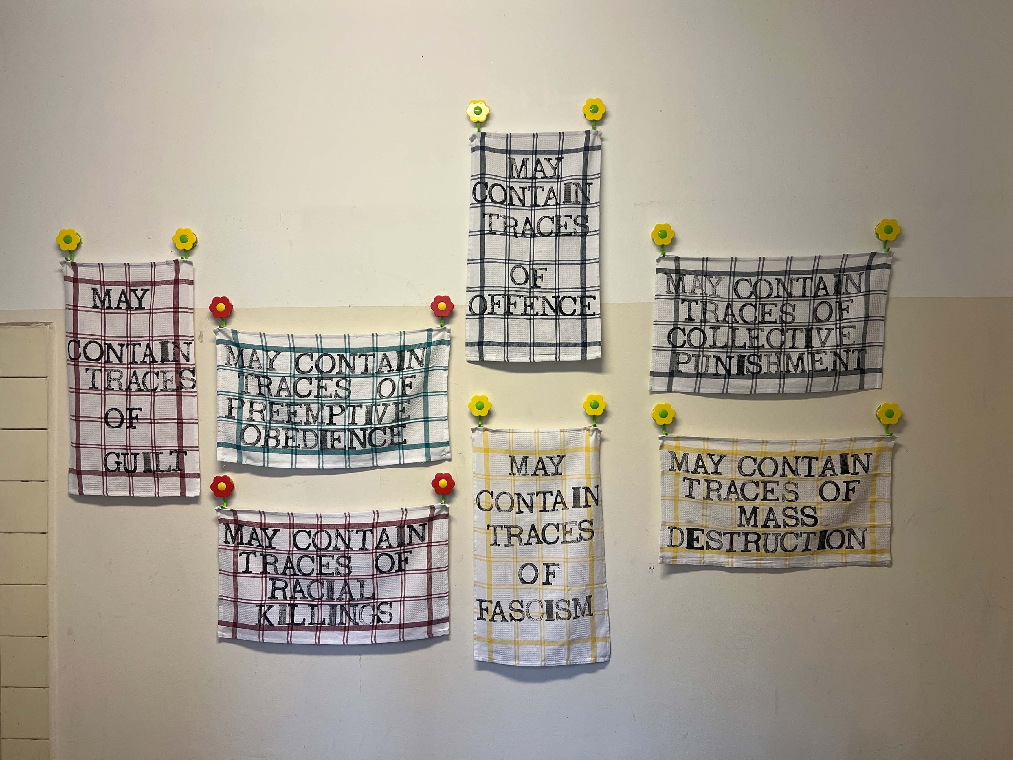 The video is rounded out with a series of ink prints on kitchen rags, listing out package warnings: “May contain traces of nationalism” or “May contain traces of fascism.” The prints operate in the same imposter mode as the video, by deliberately emulating cheap, mass-produced goods. Their humor is imme-diate, but their truth registers more deeply. After all, how can one remove blood once it has soaked into the soil?