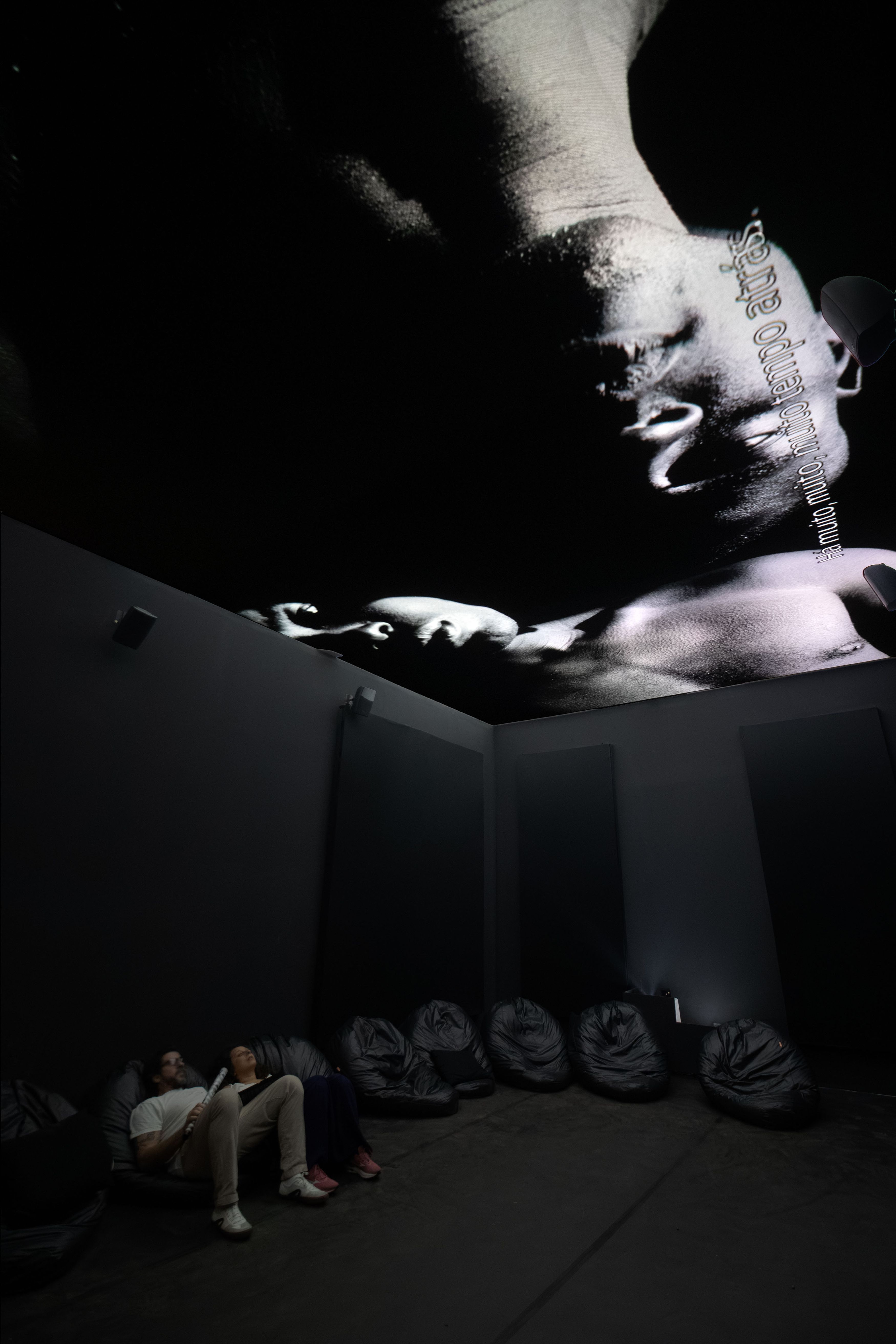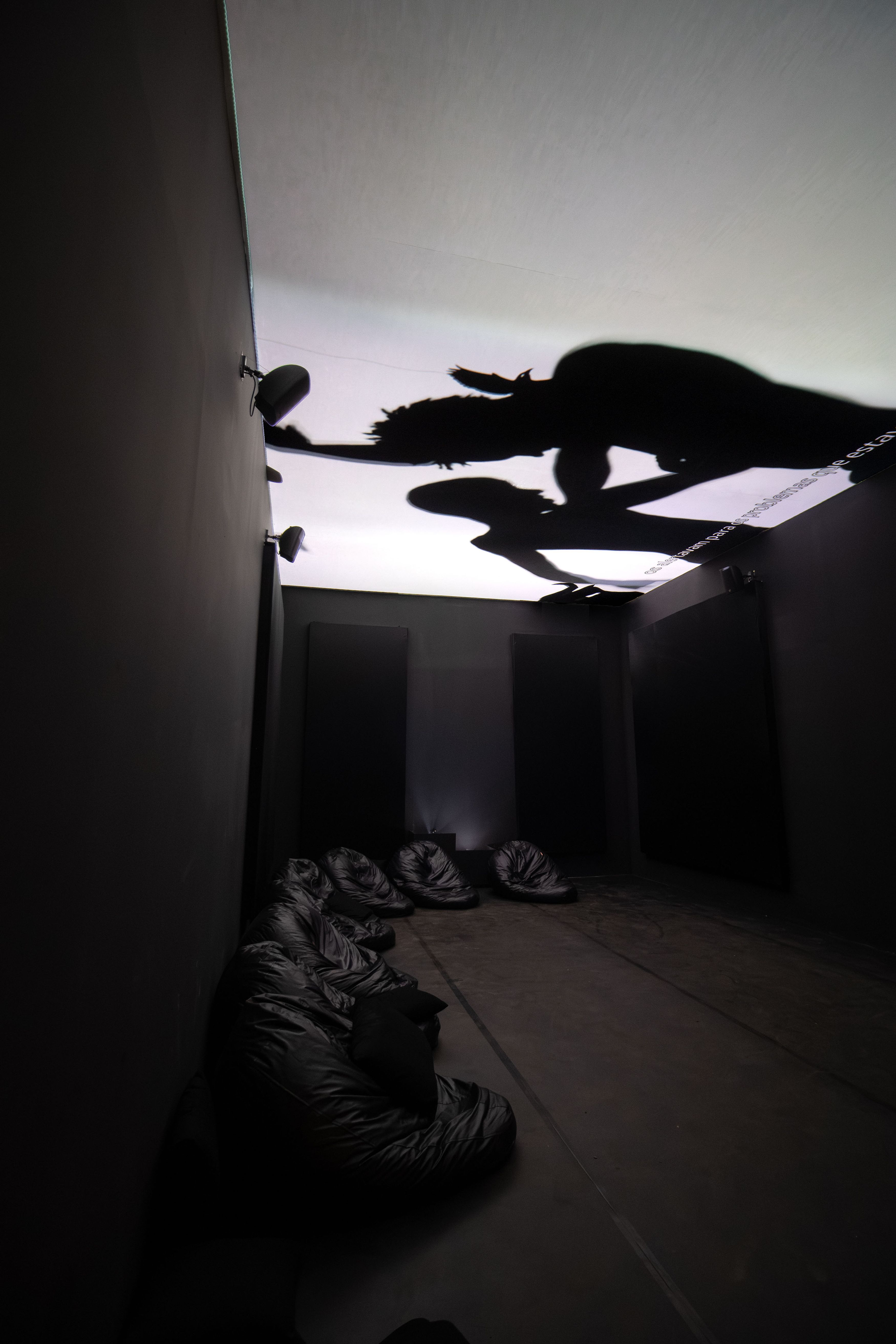 Commissioned for the 36th Bienal de São Paulo, Uambembe’s work returns to the familiar medium of video, where shadow and light interplay with the artist’s own transfixing narration. The work is introduced through a newer dimension of her practice: a painted mural at the entrance to the film booth. This medium has become an evolving part of Uambembe’s visual language, marked by portrayals of spectral presences and sites of polarity, expressed through a skilful combination of muted and acidic colors, and the integration of repetition and archival re-rendering.